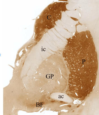 Figure 2. Coronal section of the brain of a 66-year old healthy female at the level of the anterior commissure (AC) showing part of the basal ganglia, stained for acetylcholine-esterase. Bridges of persistent gray matter in the internal capsule are the cause of the striate’s striped appearance. The part of the pallidum under the anterior commissure is called the ventral pallidum.