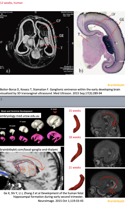 Bottom row – rotated (same) sagittal drawing and sagittal T1 weighted MR image of adult brain showing the caudate (Ca), putamen (Pu), globus pallidus (Gpa) and thalamus (Thal). The red arrow indicates the posterior and inferior growth of the caudate over the diencephalon.