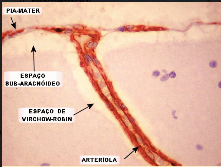 The pia and subarachnoid space continue around the arteries penetrating and perfusing the brain. There are topographic differences: the lenticostriatal arteries have a double sheet of leptomeninges and a perivascular space; cortical arteries are only covered by pia mater cells and do not have a perivascular space.