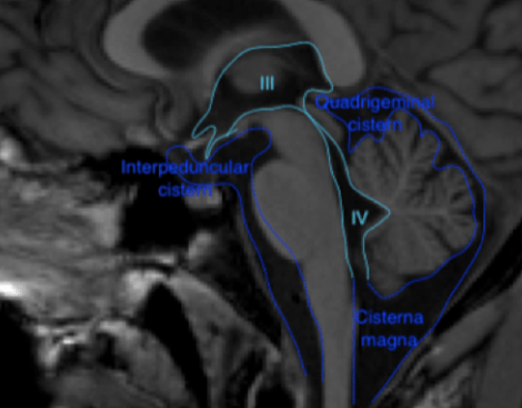 The brain and spinal cord are surrounded by 3 layers of connective tissue: (1) the pia, lying direct against the parenchyma (2) the arachnoid, which is an avascular layer bridging the cortical sulci and bridging the distance to the skull and (3) the dura mater consisting of an outer periosteal layer and an inner meningeal layer. The arachnoid and the space between the arachnoid and pia houses CSF. The widenings in the subarachnoid space called cisterns seemed like topography: something to memorize without the need for deeper knowledge.